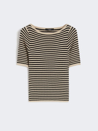DETAILS T-shirt featuring a feminine silhouette-accentuating rib-knit pattern. Stretch viscose yarn T-shirt Slim fit Boat neckline Short set-in sleeves Regular length COMPOSITION AND CARE 77% viscose, 23% polyester. Hand wash cold; do not bleach; do not tumble dry; flat drying in the shade; cool iron; professionally dry clean perchloroethylene - mild process; do not wet clean.; iron with a cloth between.; using neutral detergent. Distributed by Max Mara S.r.l., registered office in Reggio Emilia (Italy), Via Giulia Maramotti 4, 42124 (IT)