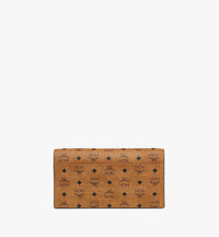 Classic elegance, joined by a true heritage hallmark. Following the Bauhaus principle of functional design, the iconic logo brass plate of the Munich House serves as a snap closure securing prized possessions inside this large monogram wallet. - Detachable leather strap - Rear exterior pocket - Logo brass plate snap closure - Interior card slots and zip compartment - Body: Visetos monogram canvas - Trim: Natural leather - 24k gold-plated brass hardware - Fabric lining - Approximately 1.4 x 7.7 x 4.1 inches - Strap drop: 21.7" - Made in South Korea