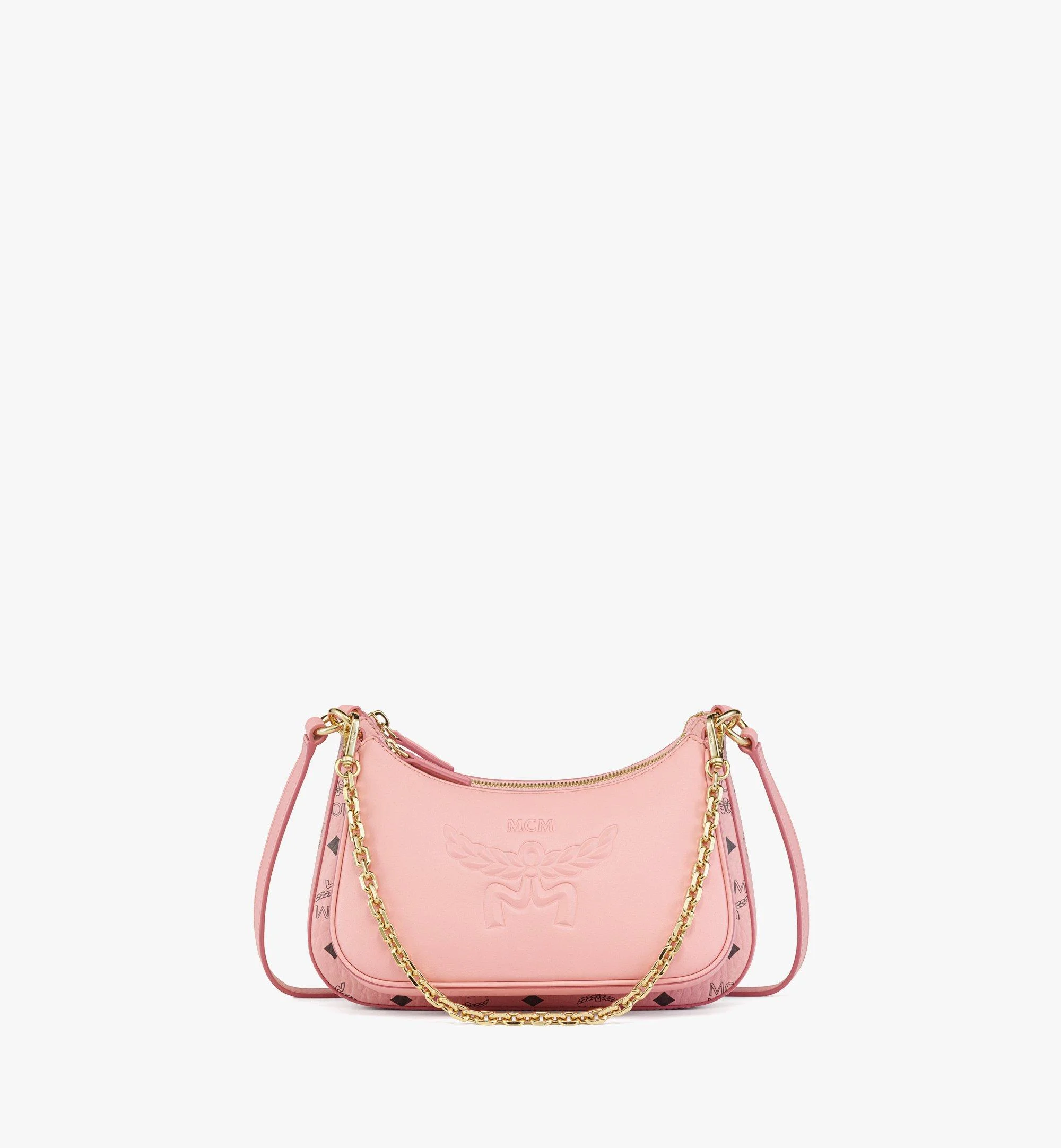 A two-in-one design expressing the timeless union of form and function. Crafted from Visetos canvas and natural nappa leather, this detachable duet of hobo bags can be joined together in an amplified display of elegance or worn independently based on the requirements of the individual and setting. - Adjustable leather strap - Removable chain handle strap - Embossed laurel logo motif - Zip closure - Large Visetos bag: Interior zip compartment - Small leather bag: Two card slots - Body: Visetos monogram canvas - Trim: Natural leather - 16k gold-plated metal hardware - Microfiber lining with suede finish - Approximately 2.2 x 10.2 x 8.7 inches - 37.4" to 46.9" strap length, Handle drop: 9.8" - Made in South Korea