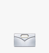 The unique handle design of this Italian mirror leather tote bag reflects the sharp contours of the Bavarian diamond — a renowned symbol of Munich. Enamel leather details complete the metallic silver silhouette. - Approximately 3.0 x 10.6 x 6.7 inches - 45.5" to 51.8" strap length, Handle drop: 1.4" - Detachable, adjustable leather strap - Bavarian diamond-inspired leather handles - MCM logo motif - Magnetic snap closure - Interior pocket and zip compartment - Trim: Enamel cowhide leather - Body: Metallic mirror leather - 24k gold-plated brass hardware - Microfiber lining with suede finish - Made in South Korea Style # MWREAAK05SV001