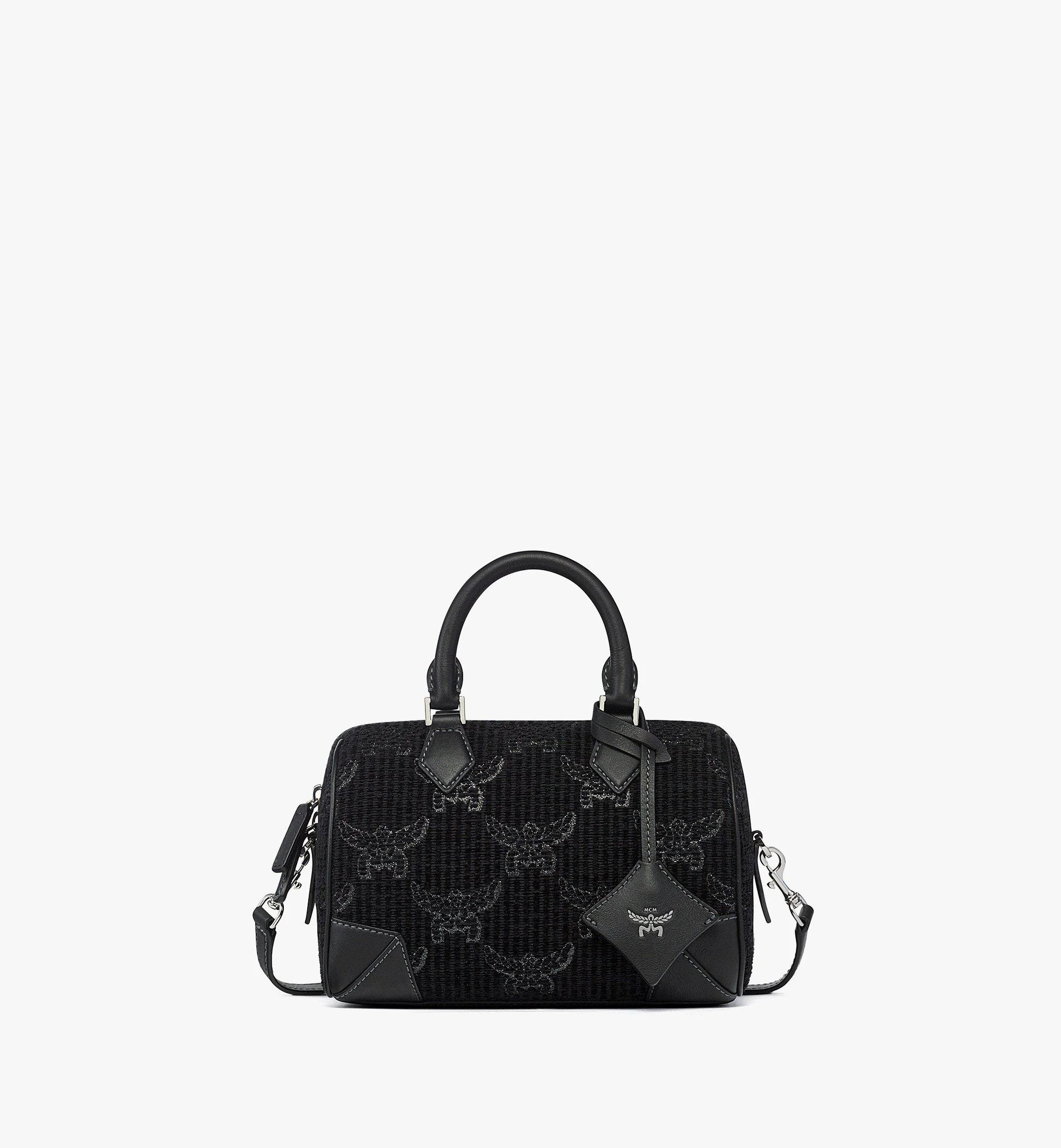 Jacquard-woven with the Lauretos monogram in metallic silver lurex yarn, the small Ella Boston bag features a timeless silhouette inspired by travel trunks from the Golden Age of Munich. A renowned insignia of our German birthplace, the Bavarian diamond informs the geometric design of the accompanying leather charm. - Removable, adjustable leather strap - Leather top handles - Detachable Bavarian diamond leather charm - Two-way zip closure - Interior slip pocket with leather patch - Leather-covered corners - Body: Lauretos monogram lurex jacquard - Trim: Natural leather - Silver-tone cobalt metal hardware - Microfiber lining with suede finish - Approximately 4.7 x 8.5 x 5.7 inches - 45.3" to 52.8" strap length, Handle drop: 3.1" - Made in South Korea