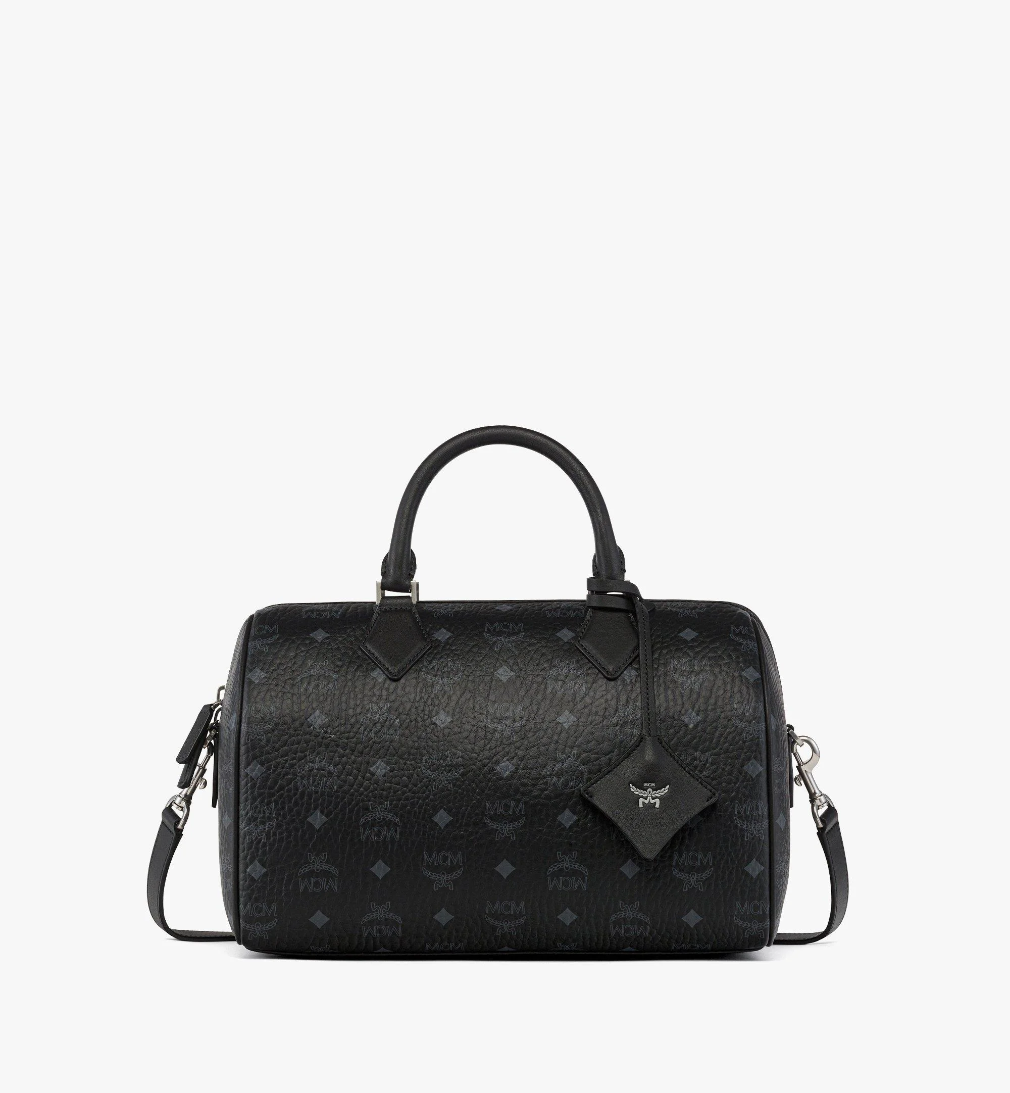 An elevated carryall born from the Golden Age of Munich. Modeled after travel trunks of that famed period, the Ella Boston bag is finished with natural leather accents including a logo-embossed charm inspired by the Bavarian diamonds. - Detachable, adjustable leather strap - Leather top handles - Removable Bavarian diamond leather charm - Two-way zip closure - Interior pocket with leather patch - Body: Visetos monogram canvas - Trim: Natural leather - Silver-tone cobalt brass hardware - Microfiber lining with suede finish - Approximately 6.7 x 12.6 x 8.3 inches - 47.8" to 56.9" strap length, Handle drop: 3.9" - Made in South Korea