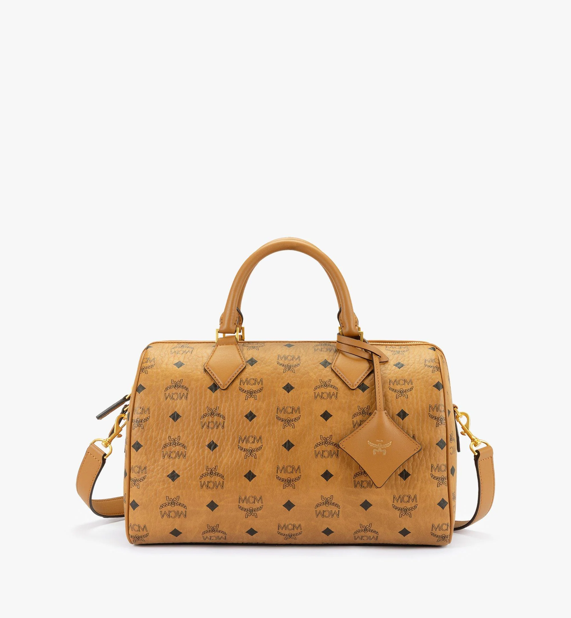 An elevated carryall born from the Golden Age of Munich. Modeled after travel trunks of that famed period, the medium Ella Boston bag is finished with natural leather accents including a logo-embossed charm inspired by the Bavarian diamonds. - Detachable, adjustable leather strap - Leather top handles - Removable Bavarian diamond leather charm - Two-way zip closure - Interior pocket and card slot - Body: Visetos monogram canvas - Trim: Natural leather - 24k gold-plated brass hardware - Microfiber lining with suede finish - Approximately 6.7 x 12.6 x 8.3 inches - 36.6" to 42.9" strap length, Handle drop: 3.9" - Made in South Korea
