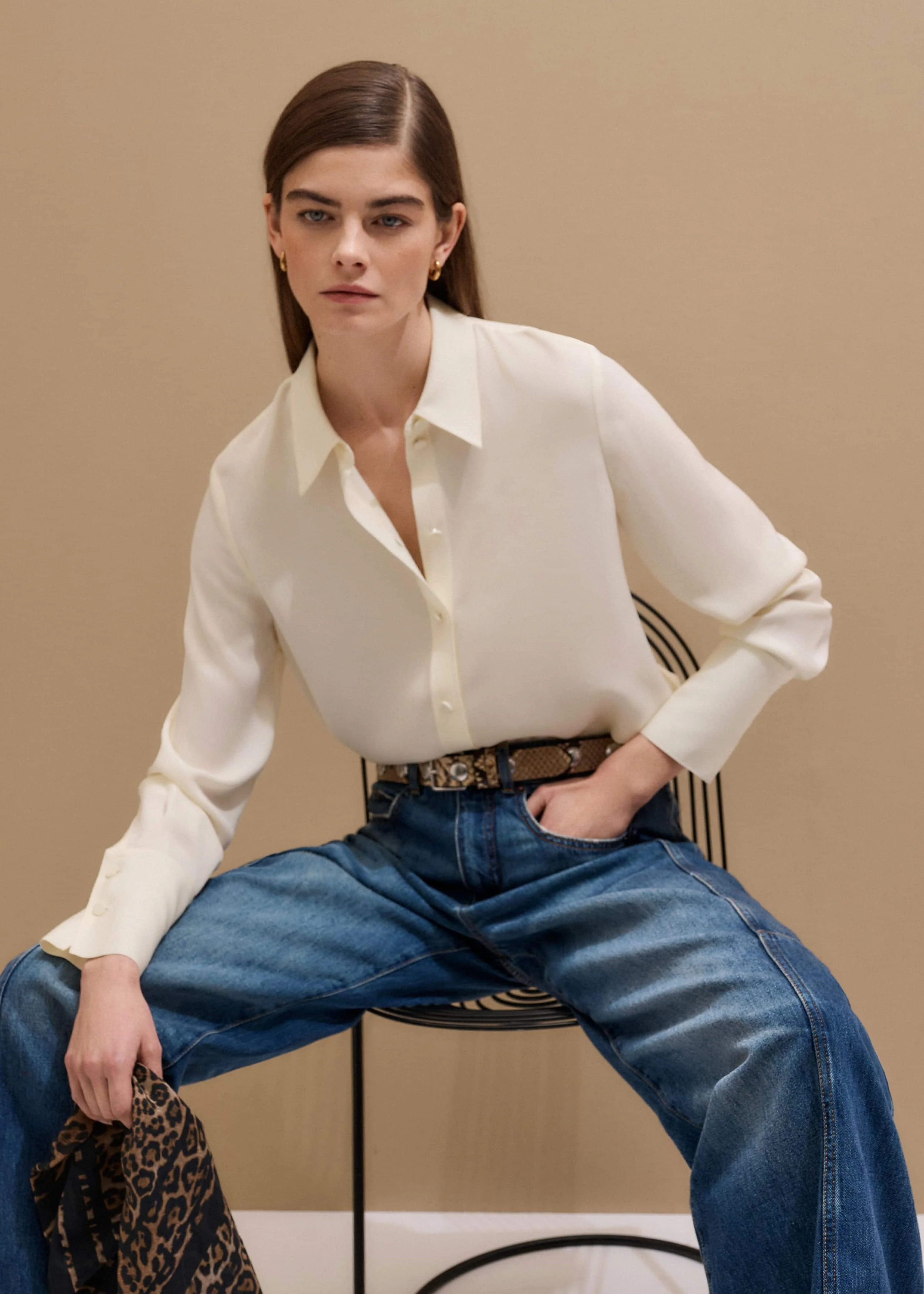 A neutral silk shirt is a wardrobe hero. This light cream style has deep button-fastened cuffs for a customisable sleeve finish and a rounded hem for a flattering, loose drape. FIT Straight fit Button fastening Mid-length Full-length sleeves with deep cuffs MODEL WEARS Model is a US size 4, wearing a US size 4 Model height is 5’9” / 175cm Fits true to size COMPOSITION 100% Silk Crafted from luxurious mid-weight silk that has a soft feel against the skin.