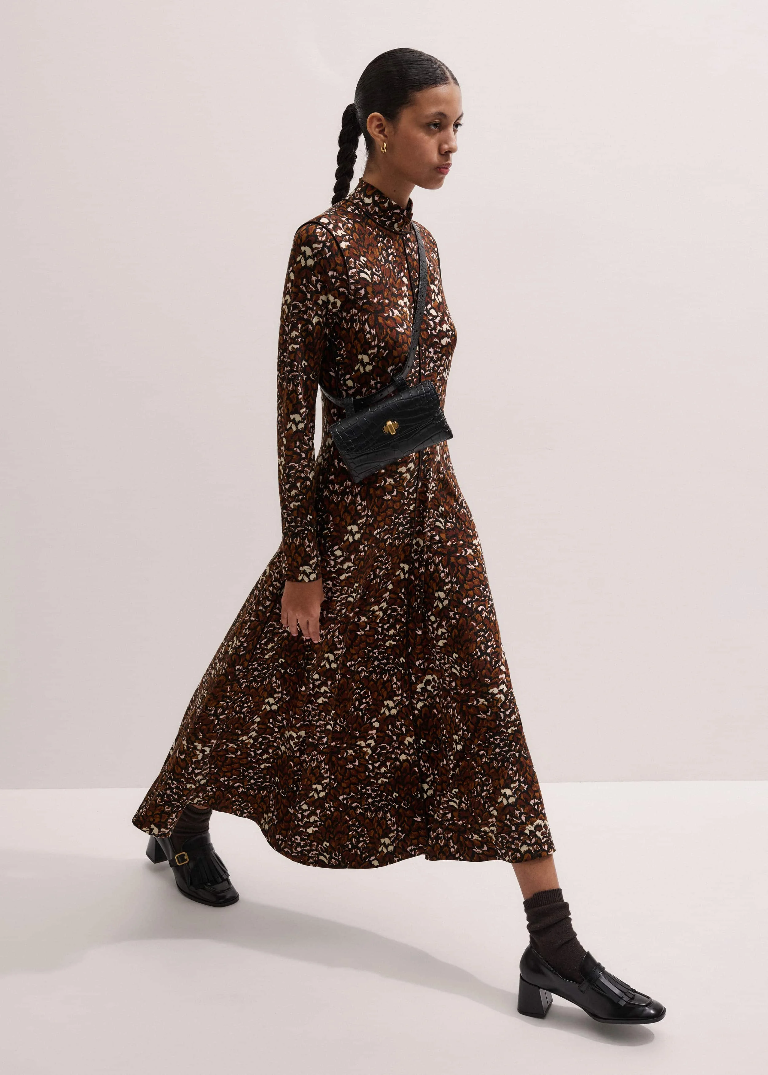 An AM-PM staple returns in our bespoke Twisting Feather print. It’s made from a fluid viscose jersey with comfortable stretch for a naturally flattering drape and shape. The darker raised seams highlight the fit-and-flare silhouette. FIT Fit and flare shape High neckline Back neck zip Full-length sleeves Level hem Maxi length MODEL WEARS Model is a US size 4, wearing a US size 4 Model height is 5'10'' / 177cm Fits true to size COMPOSITION 93% Viscose, 7% Elastane This printed dress is crafted from a stretch, fluid viscose jersey which offers a flattering shape and drape.