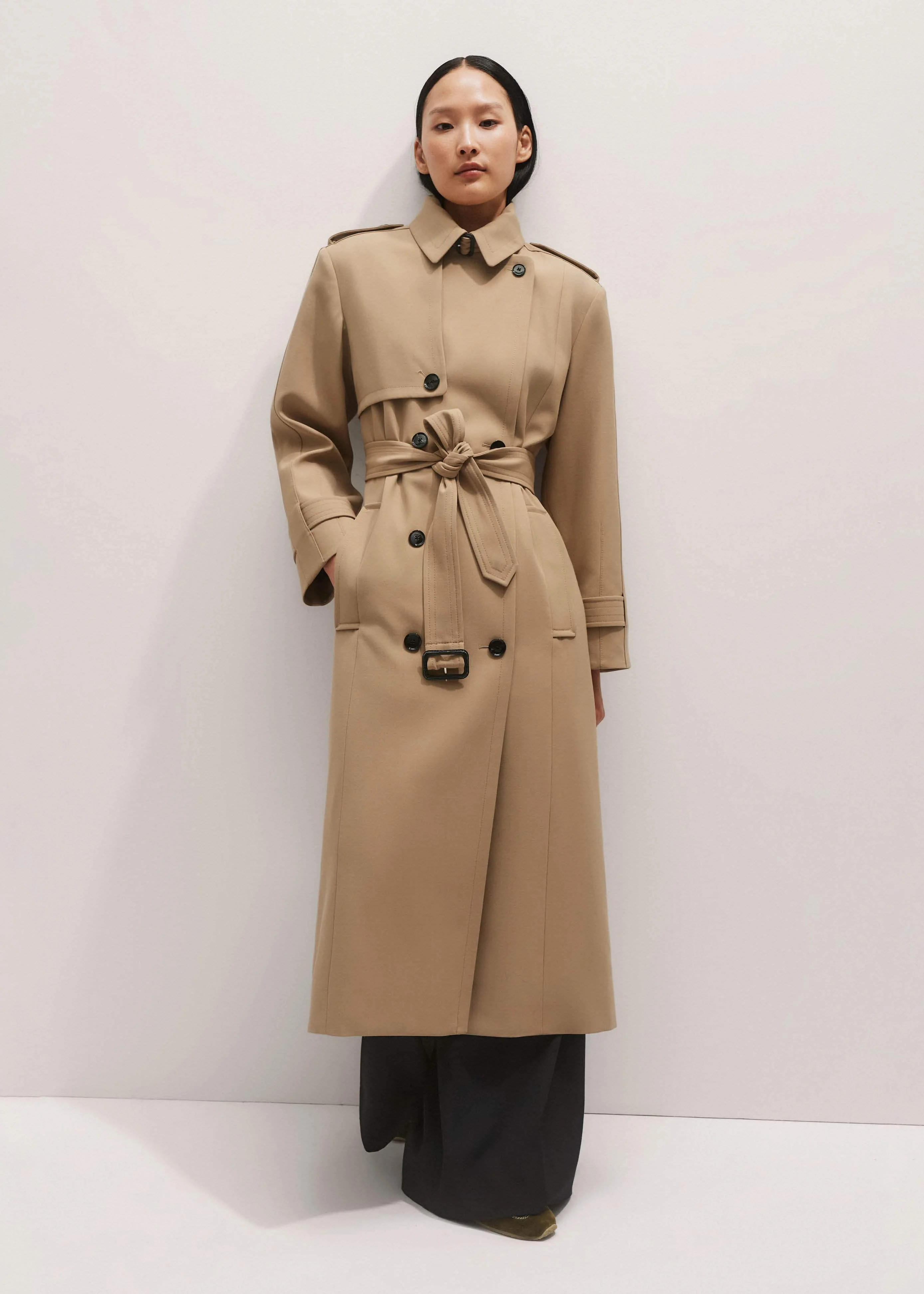 Our relaxed take on the classic trench made from water-resistant wool-blend tailoring that holds its shape whilst still achieving a fluid drape. It’s designed with padded shoulders that create soft structure, whilst the optional tie belt creates a more fitted finish. FIT Double breasted Button through front Long sleeves Functional pockets Relaxed fit Longline MODEL WEARS Model is a US size 4, wearing a US size 4 Model height is 5'9.5"" / 177cm Fits true to size with a relaxed fit - we recommend sizing down for a more fitted look COMPOSITION Main Fabric: 52% Polyester, 46% Wool, 2% Elastane Body Lining: 100% Viscose Sleeve Lining: 51% Polyester, 49% Elastomultiester Crafted from water-resistant wool-blend tailoring fabric with a clever blend of structure and fluid drape. This style has a stretch-infused sleeve lining for added comfort.