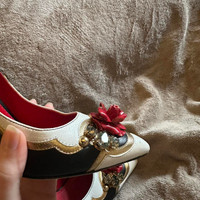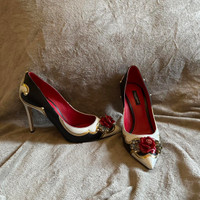 The Dolce&Gabbana Black White Red Rose Crystal Embellished Court Heels in size 37 and UK size 4 are a stunning and elegant choice for any party or cocktail occasion. Made in Italy from luxurious leather, these heels feature intricate filigree detailing and embellishments, adding a touch of sophistication to any outfit. The bold black and white colour scheme, along with the signature rose crystal detail, makes these heels a stylish and eye-catching accessory for any woman's wardrobe. Dolce Gabbana Black White Red Rose smoky Crystal Embellished 37 4 Court Heels Filigree with gold metal studs and leather roses