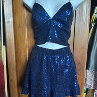This New Look sparkly glitter sequin black and blue crop top shorts jumpsuit in size 8 is a stylish and eye-catching outfit perfect for a night out or special occasion. The set includes a pair of shorts and features sequin accents, adding a touch of glamour to the overall look. The machine washable jumpsuit is designed for regular sizing and is part of the Women's department. Perfect for those who want to make a statement with their outfit choice. New Look Sparkly Glitter Sequin Black Blue Crop Top Shorts Jumpsuit Co Ord 8 sequin jumpsuit, glittery outfit, crop top set, statement two-piece, party wear, evening glam, black blue shimmer, night out ensemble, BLMS, shiny fabric