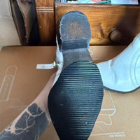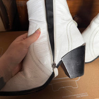 The Office White Genuine Leather Croc White Cowboy Ankle Boots are a stylish and versatile addition to any woman's wardrobe. With a pointed toe and cowboy style, these boots are perfect for casual occasions during the winter season. Made from high-quality bullhide leather, they feature a zip accent and a standard shoe width for comfort. The mid-calf shaft and 2-inch platform height add a touch of flair to these timeless boots, making them a fashionable choice for the modern woman. Office White Genuine Leather Croc White Cowboy Ankle Boots 5 38 Genuine leather with some scuffs on the leather The soles of the boots have been lined with anti-slip rubber croc textured, pointed toe, cowboy ankle boots, leather boots, mid-calf height, platform sole, white footwear, slip-resistant soles, western style, stylish boots