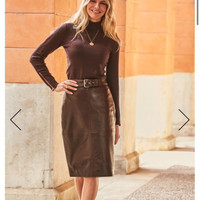 Elevate your wardrobe with the timeless elegance of this chocolate brown leather pencil skirt from sosandar. Fashioned from genuine real leather, this midi skirt is a perfect blend of sophistication and edge, featuring a sleek straight design and a stylish buckle accent that adds a touch of class to your ensemble. Ideal for business settings or chic evening outs, the skirt comes in a regular size 6, ensuring a comfortable fit. The practical zip closure ensures a secure and flattering silhouette. Step out in confidence with this versatile piece that promises to be a staple in your collection. Model is 5'9 and wears a UK size 8 Product composition: 100% Leather | Lining: 100% Polyester Product length: 65cm Product code: S21SL002BN0011 Care information: Dry Clean Only Brand new but no tags as I pulled them off, but it was too big for me! In my opinion this 6 fits more like an 8. SOSANDAR Chocolate Brown Genuine Leather Buckle Detail Pencil Skirt
