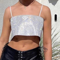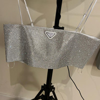 Prada reworked top never worn got it for my birthday but it’s too big! Just want back the money I paid for it as k cannot return! I’m a size 6/8 this is a s/m defo comes big! I would say this would best fit a size 10!! Dm for more info #prada #sparkle #croptop #silver
