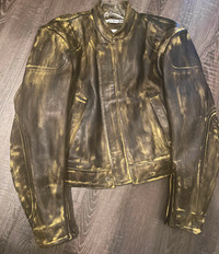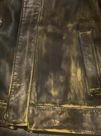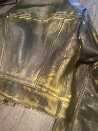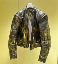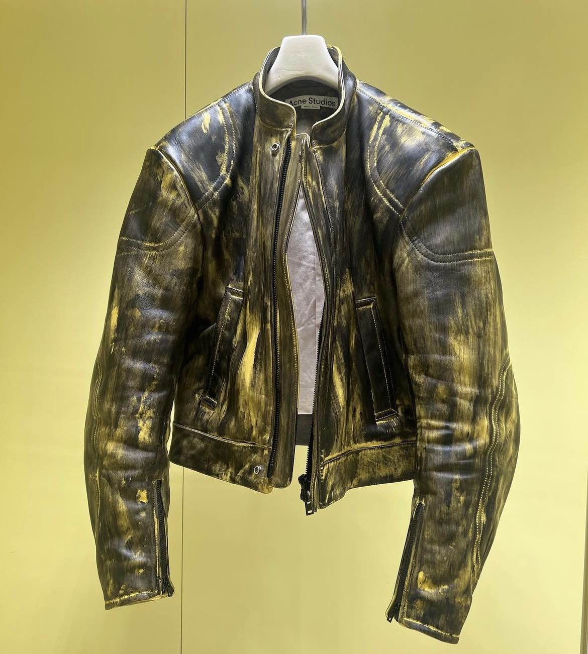 Brand new Acne Studios Runway FW22 hand painted leather biker in Black/yellow. Cropped hem, elongated sleeves with zippers and mandarin collar. Euro size 48