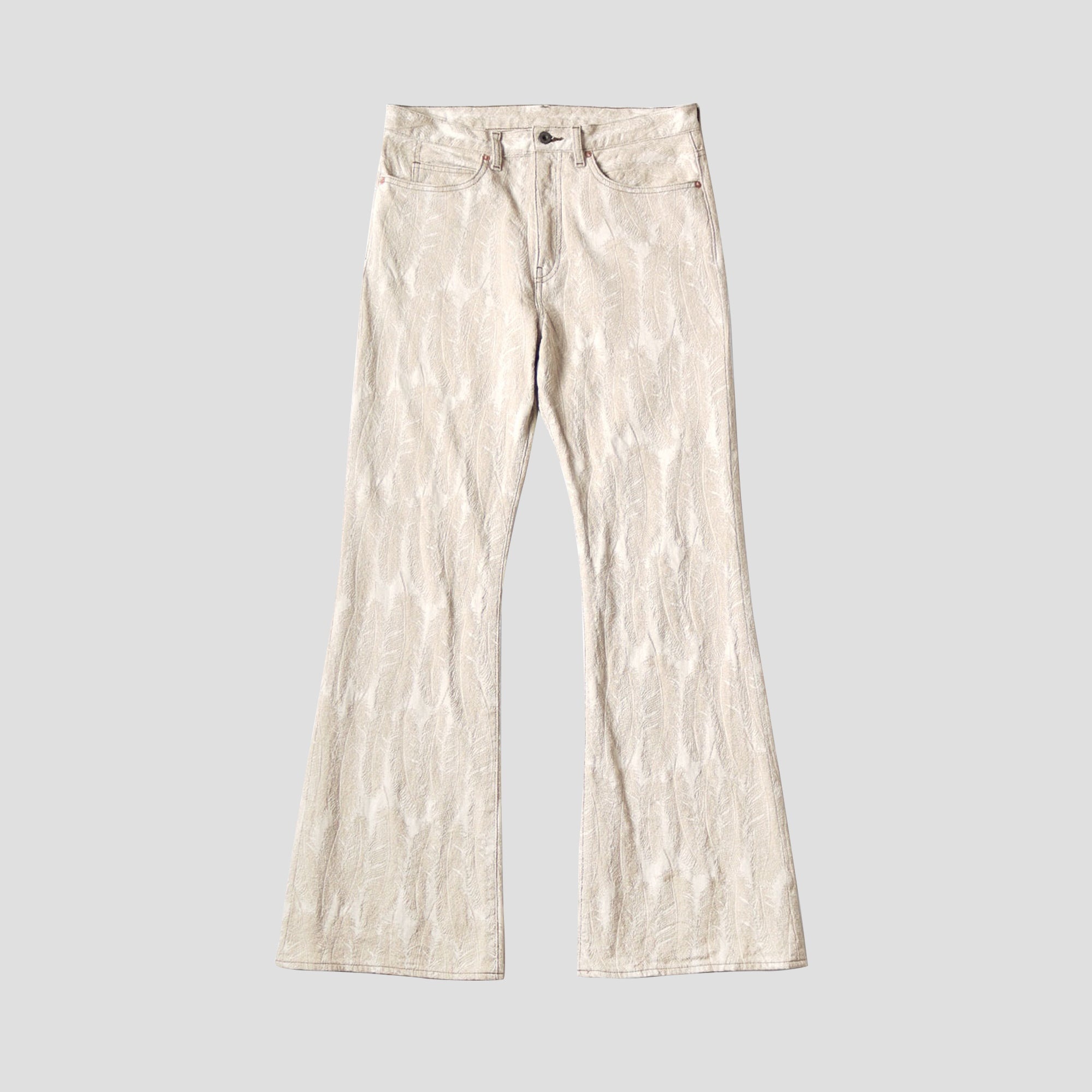 *100% Cotton *Feather Denim Jacquard *2 Side Pockets & 2 Back Pockets *Front Zip-ups *Boot Cut *Made in Japan