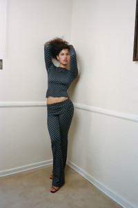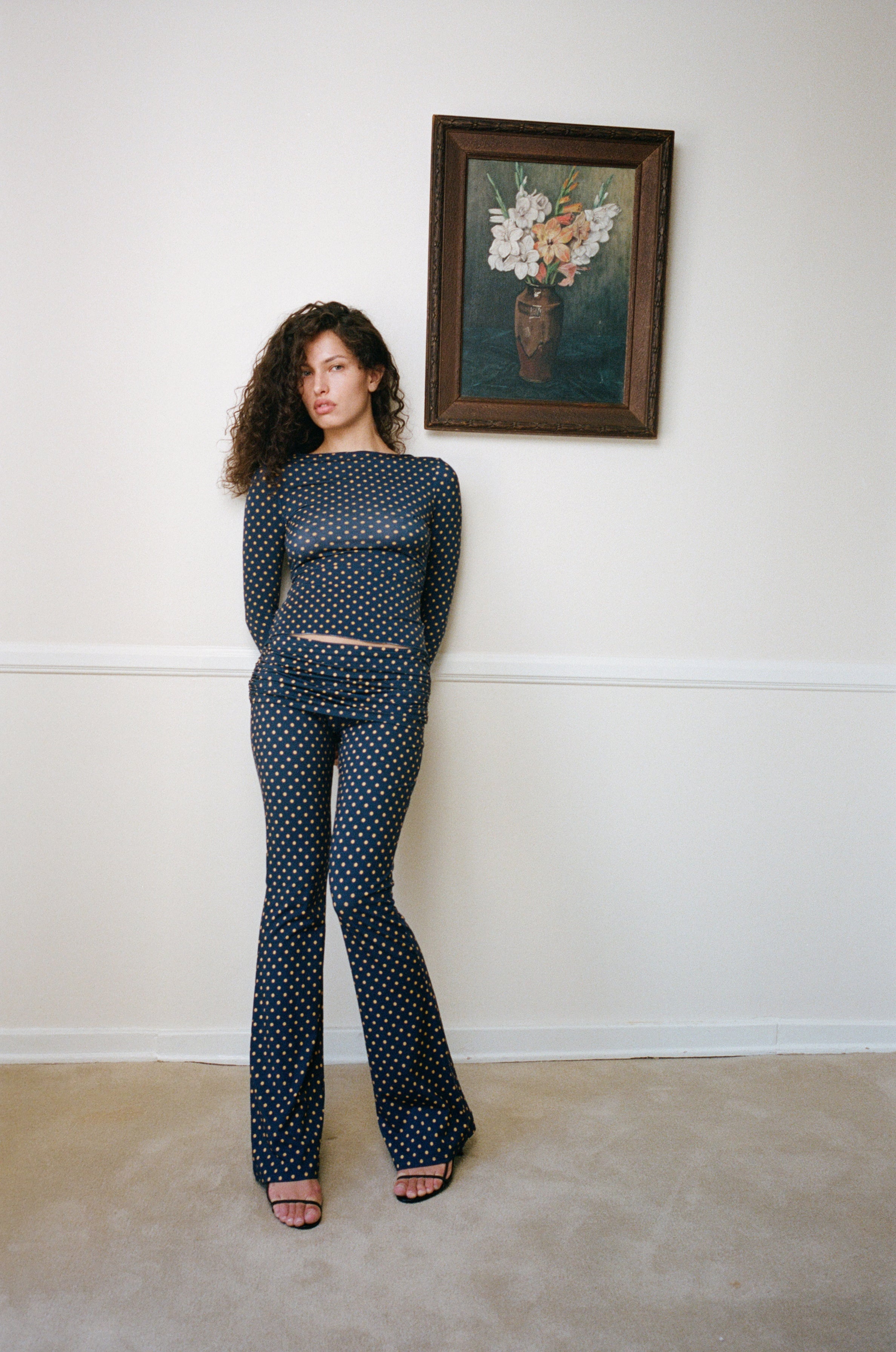 Introducing our Alana Pant in Polka Dot. This mid-rise sheer pant flares slightly at the bottom and can be folded over along the waist as a styling detail. The perfect everyday pant. True to size, sculpting fabric. Please refer to the flat lay image for product accuracy. <!--td {border: 1px solid #cccccc;}br {mso-data-placement:same-cell;}-->