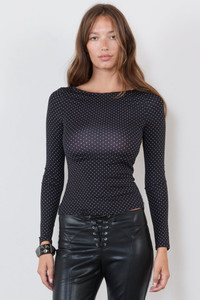 Our bestselling Amelia Top is back in Black and White Polka Dot. Featuring perfect long sleeves, a boatneck, and ultra soft fabric - it's no wonder she's always sold out. Miaou's fan fave fabric, Cotton Jersey - 93% Tencel, 7% Spandex Model is 5'7.5" and wears a size Small. Her measurements are: Bust-31.5” Waist-24” Hips-34.5”. Machine Wash Cold. Inside Out Gentle Cycle. With Like Colors. Lay Flat To Dry. Do Not Bleach. Warm Iron If Needed.