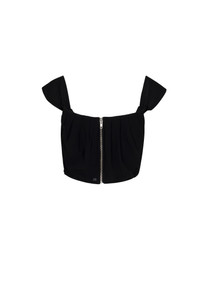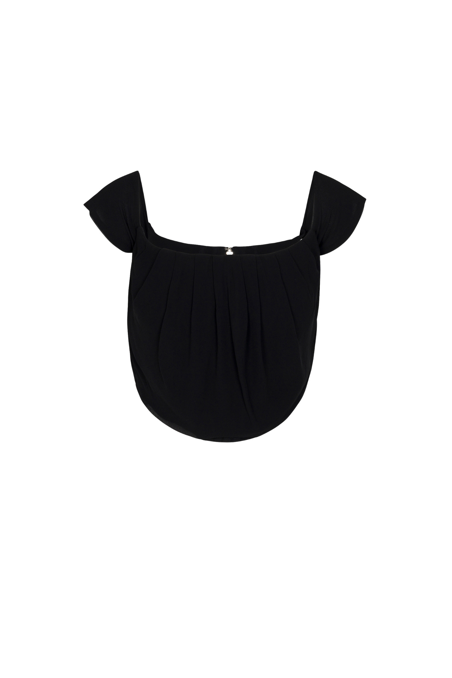 Preorder. By popular demand we've brought back an OG, the Cleo Corset, in black georgette. She's an off shoulder, cropped number with a back zipper and fitted bodice. Perfect for a night out. Pair with our sexy, sheer Rue Skirt. Georgette fabric: 100% viscose Amata is 5'7" and wears a size XS. Her measurements are: Bust-30” Waist-23” Hips-34”. Green Dry Clean,Do Not Machine Wash.