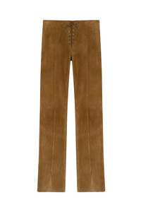 The Element Pant - now in Tan Suede. Features a front lace up closure, slits at each hem, and detailed seams. Fits like a glove. 100% Sueded Leather Emilia is 5'5" and wears a size XS. Her measurements are: Bust-29” Waist-24” Hips-35.5”. Dry Clean Only. Do Not Machine Wash.