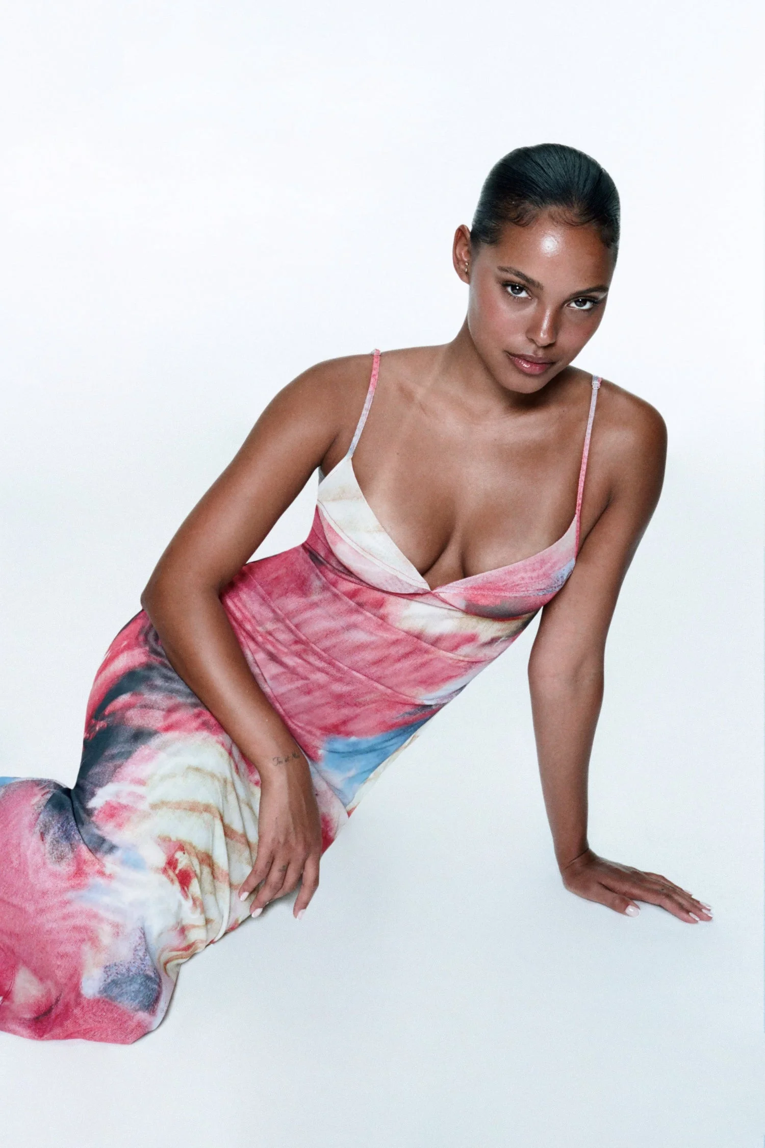Say hello to the Florence Dress, now in our new Flare print. This long, sheer beauty contours your body in all the right places while remaining breathable. Crafted from sumptuous mesh material with a back closure and built-in bra cups. Made with Miaou mesh: 94% recycled polyester, 6 spandex. Jasmine is 5'9" and wears a size S. Her measurements are: Bust-34” Waist-23.5” Hips-34”. Green Dry Clean Only. Do Not Machine Wash.