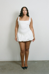 Meet the Grace Skort in Dove. This low-rise mini skirt has a bubble silhouette that adds a chic touch to any outfit, perfect for day or night and it has build in booty shorts for total comfort. True to size. Please refer to the flat lay image for product accuracy.