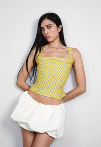 Meet Imogene, our latest silhouette in Yellow Polka Dot. The Imogene is a fully lined corset with a cowl neckline and back boning. She sure is one of a kind. Pair her with your favorite denim, or our Micro Mini Skirt. True to size. Please refer to the flat lay image for product accuracy.