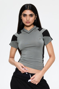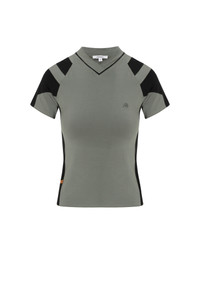 The Mel Tee is back in a transitional agave palette. She features a sculpting v-neck and athletic-inspired shoulder paneling. Pair with our cotton fleece sweats. Liquid Jersey Fabric: 96% Tencel, 4% Spandex Ria is 5'7.5" and wears a size XS. Her measurements are: Bust-31.5” Waist-24” Hips-34.5”. Machine Wash Cold. Inside Out Gentle Cycle. With Like Colors. Lay Flat To Dry. Do Not Bleach. Warm Iron If Needed.