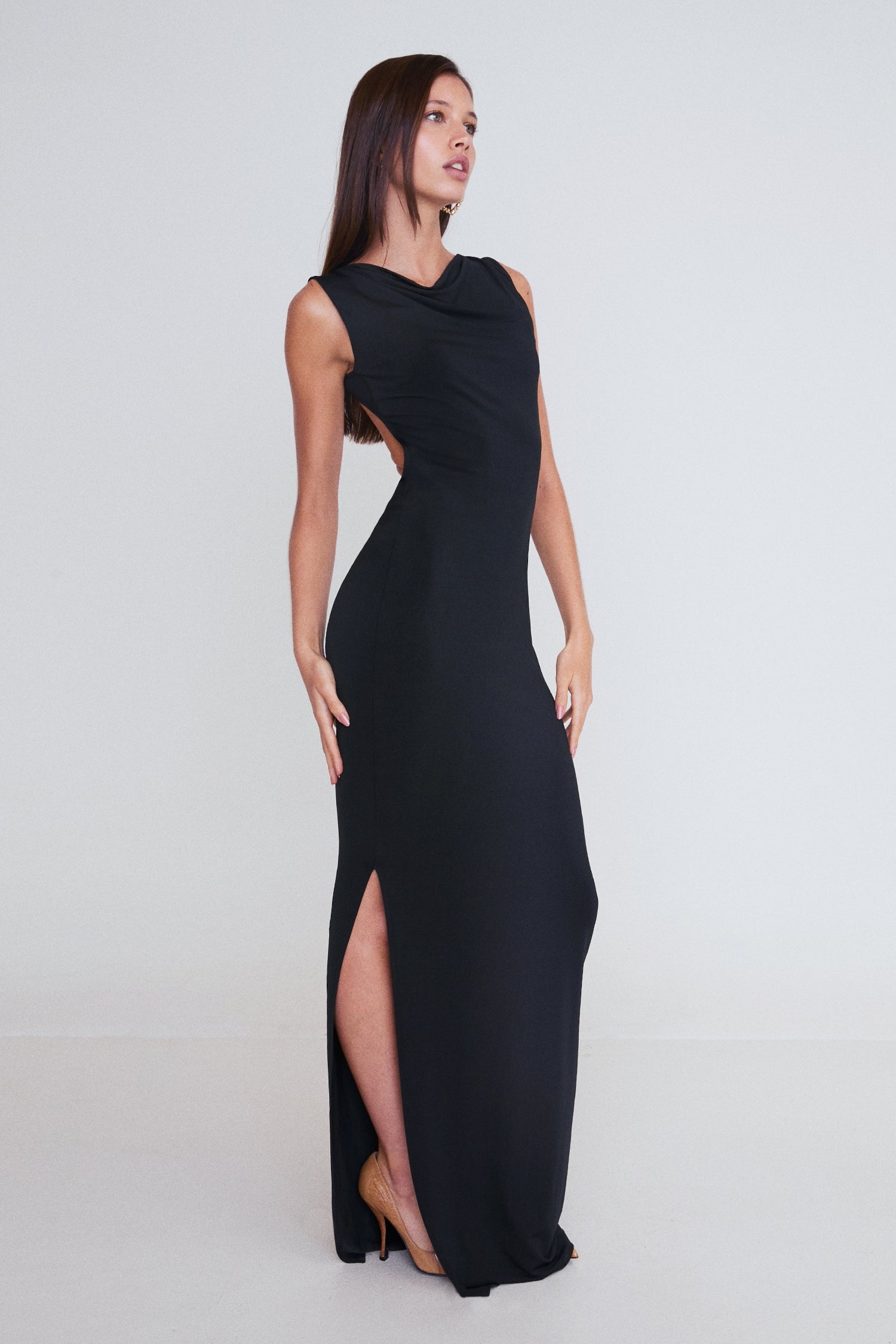 Elevate your evening with our Selena Dress in Jet Black. This fitted, maxi-length beauty is designed to flatter with its cinched waist and open back detailing. Sleeveless and sleek, Selena is the epitome of timeless elegance. She's the long dress you've been waiting for. True to size. Please refer to the flat lay image for product accuracy.