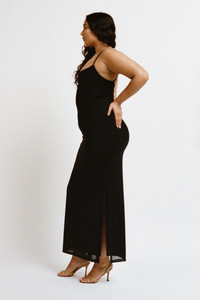 Our Thais Dress is a mesh-lined maxi dress with a sultry side slit, made to accentuate your body in all the right places. Reimagined in Black, she is sure to turn heads. Slip her on (or off) as you please... Designed for a tight fit, runs small. Please refer to the flat lay image for product accuracy.