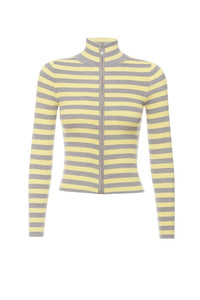 Preorder - ships in July. The Vlad Zip Up in Butter Stripe is a comfy, sensual knit for all seasons. New Miaou logo zipper pull. She's thick enough to wear as a top, but light enough to layer over a Mini Tee. Pair with our matching soft knit Colette Bodysuit. Miaou's signature Soft Knit fabric: 50% Viscose 22% Nylon 28% Polyester Model is 5'8" and wears a size Small. Her measurements are: Bust-31” Waist-23” Hips-37.5”. Green Dry Clean Only. Do Not Machine Wash.