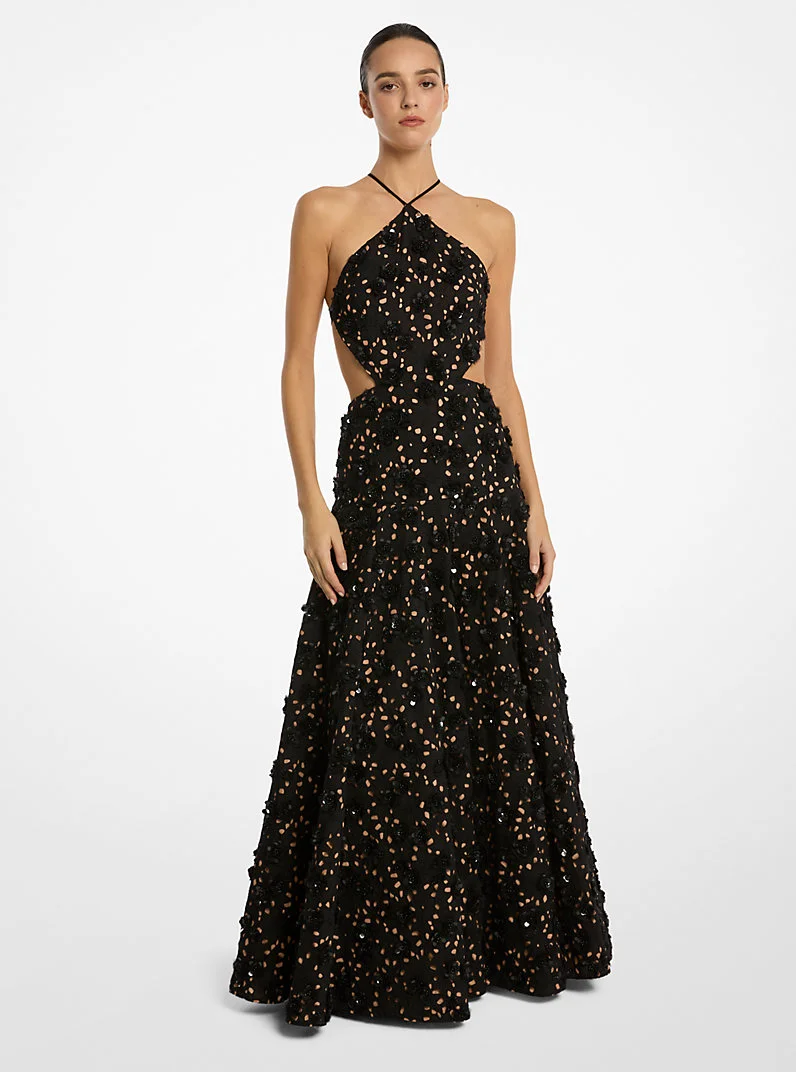 Hand-Beaded Floral Cotton Eyelet Cutout Halter Gown