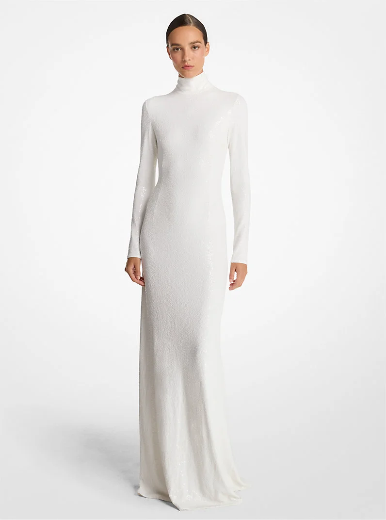 Hand-Embroidered Sequin Stretch Matte Jersey Mock Neck Gown