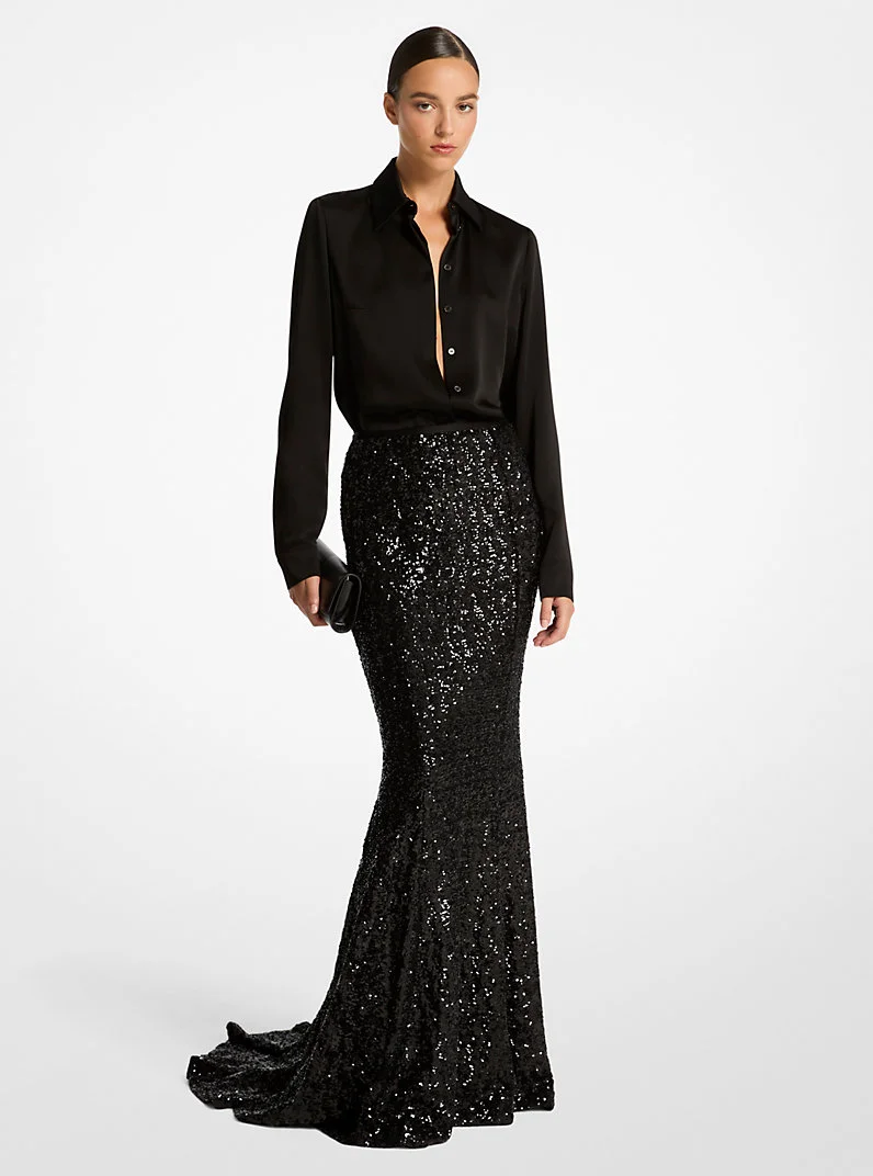 Embroidered with thousands of light-catching sequins, this elegant evening skirt is the ultimate expression of glamor. A dramatic fishtail silhouette and floor-sweeping hem add to its showstopping sensibility. Balance the shimmer by styling it with minimal separates. Made in Italy. - Skirt - Stretch polyamide - 91% polyamide/9% elastane - Lining: 82% polyamide/18% elastane - Zip fastening - Dry clean - Made in Italy - Model is 5’10”/178 cm wearing US size 2 - Style # ESB7550058