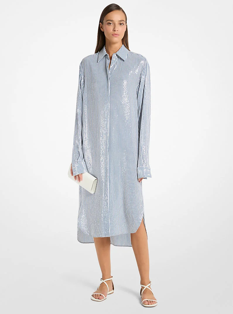 Sequined Stripe Crepe De Chine Shirtdress