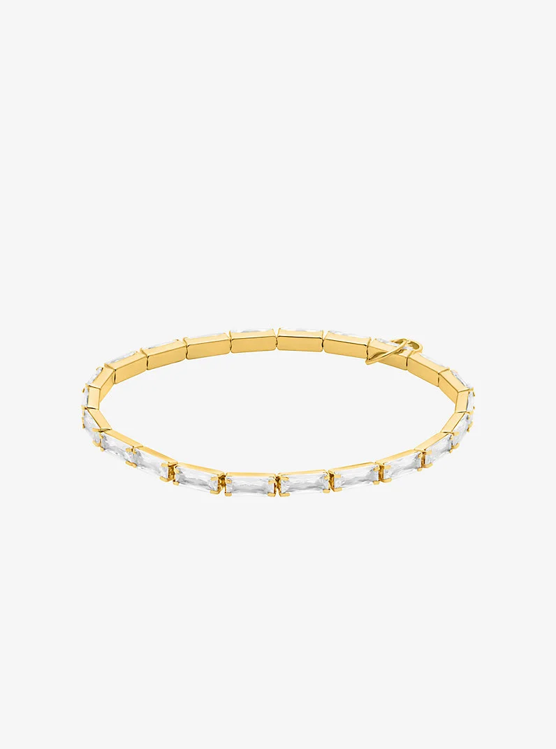 The tennis bracelet remains a jewelry essential. Our latest take on a classic, this precious metal-plated brass version is set with glistening cubic zirconia that reflect the light from every angle. The secure clasp ensures it sits comfortably against your wrist. - Bracelet - Silver-tone brass - Available in: gold tone and silver tone - Cubic zirconia - 0.1”W X 6.5"L - Imported - Michael Kors jewelry is made of precious metals combined with various elements including semi-precious stones. Apply perfume and cosmetics prior to putting on your jewelry. To clean your jewelry, wipe with the soft buffing cloth provided. Keep your jewelry away from moisture as it promotes tarnish. We recommend storing your jewelry in a clean, dry place, such as the pouch that the product comes in. - Style # MKJ8614