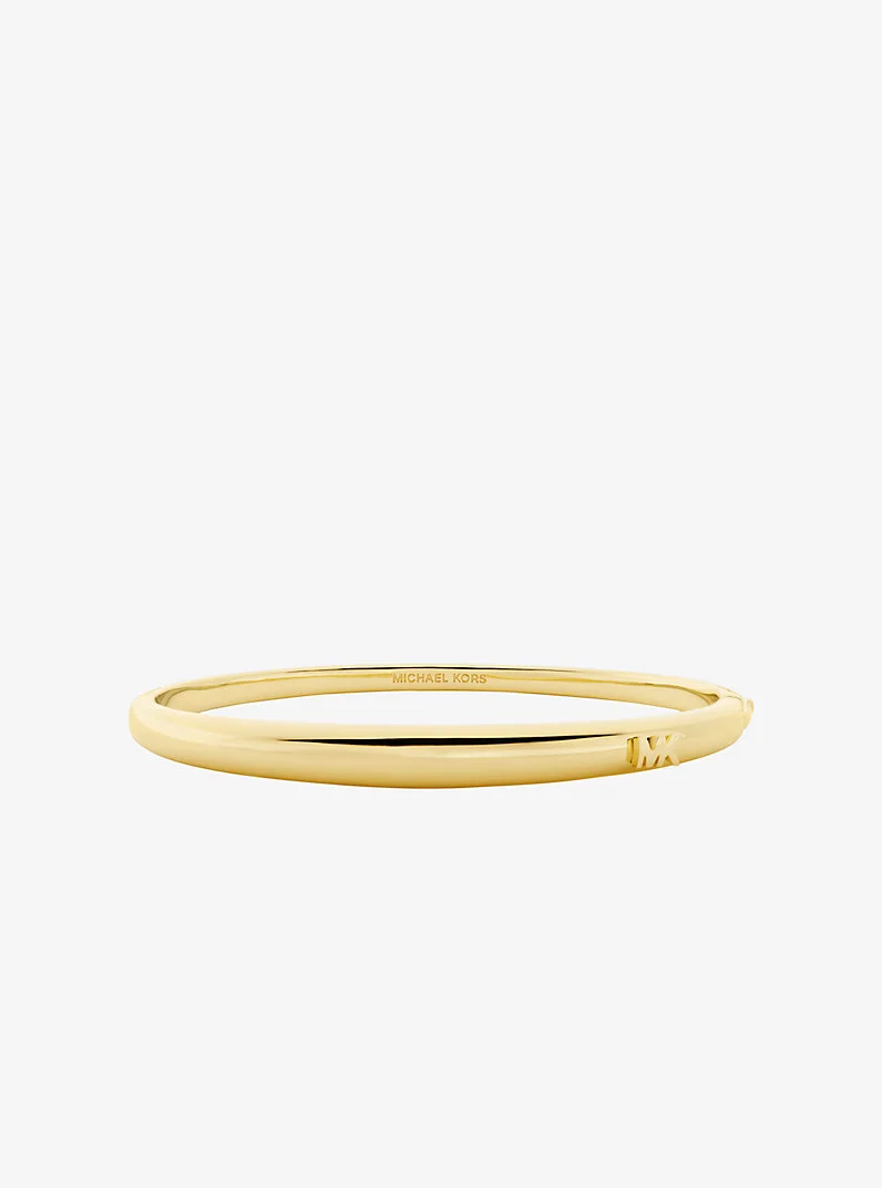 This glamorous take on the classic bangle is the perfect finishing touch to your wrist stack. A gold-tone finish and our iconic logo create a look that’s undeniably chic. Wear yours alone for a minimalist look, or with other pieces for an eye-catching statement. - Bracelet - Gold-tone brass - 0.26" inner circumference - Foldover clasp - Imported - Apply perfume and cosmetics prior to putting on your jewelry. To clean your jewelry, wipe with the soft buffing cloth provided. Keep your jewelry away from moisture as it promotes tarnish. We recommend storing your jewelry in a clean, dry place, such as the pouch that the product comes in. - Style # MKJ8540