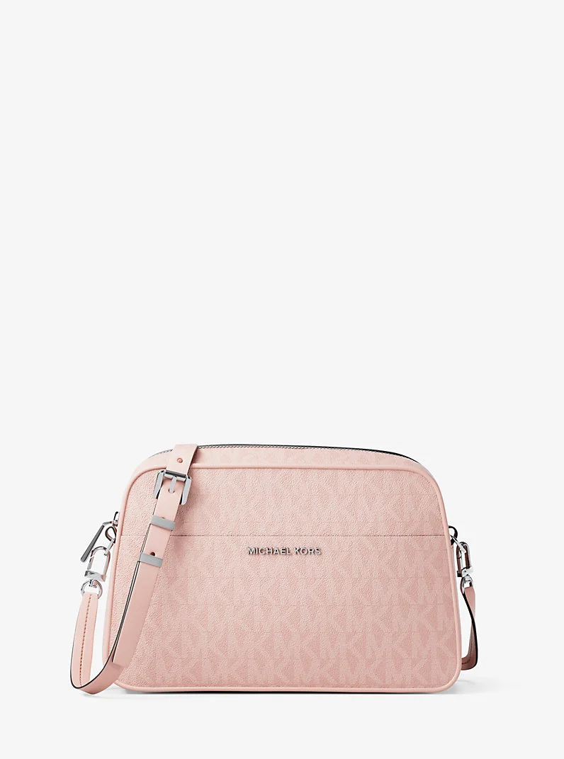 Elevate your everyday essentials with our Jet Set camera crossbody bag, featuring our Signature logo print with matching trim for a polished finish. This compact style offers effortless hands-free convenience with a removable strap and curved silhouette that sits comfortably against the body. With its iconic monogram pattern and gold-tone hardware, it's the perfect accessory to complement both casual daywear and evening ensembles. - Crossbody bag - Logo-print canvas - 89.4% coated canvas/9.6% polyester/1% polyurethane - Trim: 60% polyurethane/40% polyester - Silver-tone hardware - 8.5”W X 5.5”H X 3”D - Adjustable strap: 19.5"-21.75" - Exterior details: front slip pocket, detachable strap - Interior details: back slip pocket - Lining: 100% polyester - Zip fastening - Dust bag not included - Imported - Style # 32F5SJ6C5V