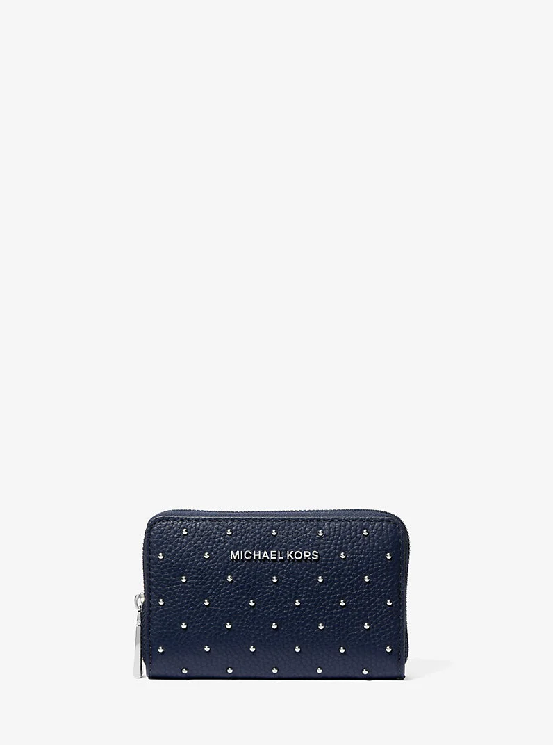 Sized to fit into your favorite tote, this studded leather wallet is fitted with two pockets and has a slip compartment for bills and receipts. The zip-around design renders it a smart choice when you want to keep your cash safe. - Wallet - Pebbled leather - 100% leather - Silver-tone hardware - 5”W X 3.25”H X 0.75”D - Exterior details: back slip pocket - Interior details: 4 card slots, center zip pocket - Lining: 100% polyester - Zip fastening - Imported - Style # 32R6SJ6D0I