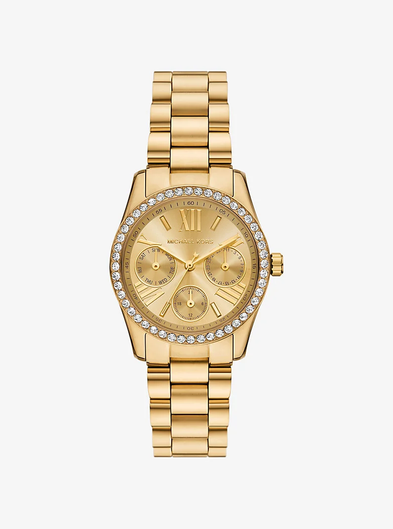 The mini Lexington watch dazzles with its sparkling pave bezel and sophisticated dial featuring Roman numerals. Crafted from gold-tone stainless steel with a classic three-link bracelet, this timepiece adds a touch of glamour to both daytime and evening looks alike. - Watch - Stainless steel - Gold-tone hardware - Pave topring - Mini - 34mm case - Quartz/multi-hand movement - Clasp fastening - Water resistant up to 5 ATM - 2-year warranty - Imported" - Style # MK4982