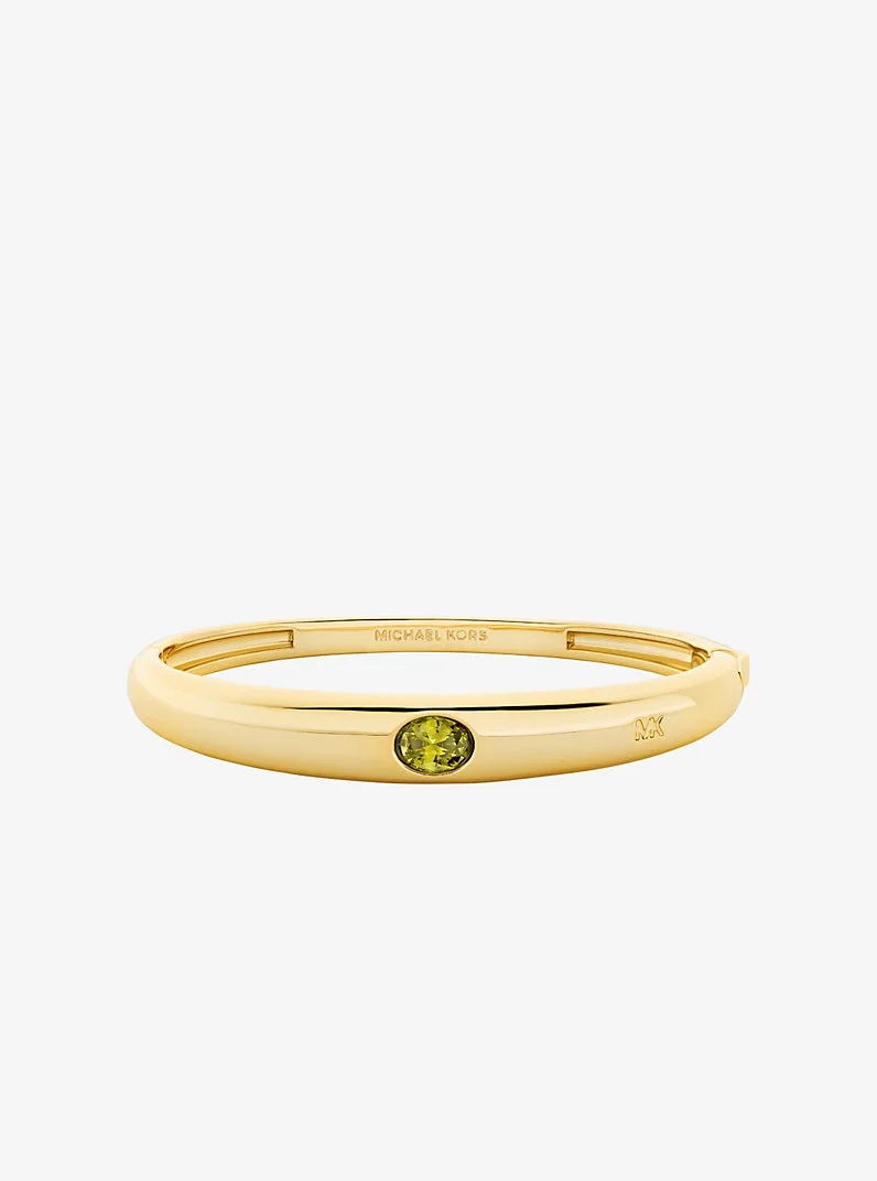 A timeless addition to your jewelry collection, this bangle is distinguished by a colored shimmering cubic zirconia and a sleek design that easily glides on the wrist. Collect it in every gemstone and wear it stacked as a trio for a layered look. - Bangle - Gold-tone brass - Cubic zirconia - 0.35" inner circumference - Box and tongue clasp - Imported - Apply perfume and cosmetics prior to putting on your jewelry. To clean your jewelry, wipe with the soft buffing cloth provided. Keep your jewelry away from moisture as it promotes tarnish. We recommend storing your jewelry in a clean, dry place, such as the pouch that the product comes in. - Style # MKJ8476