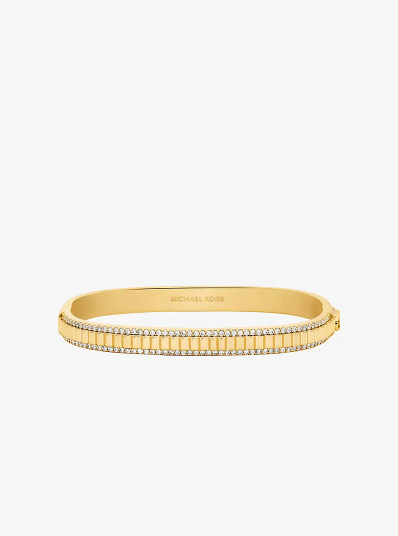 Dainty gold-tone notches in between dual rows of glittering pave on this statement-making bangle. It’s crafted from high-shine plated brass and secured by a concealed clasp. Stacked or alone, you’ll love how it pairs seamlessly with your everyday jewelry assortment. - Bangle - Gold-tone brass - Cubic zirconia - 0.25”W X 7"L - Push-button fastening - Imported - Michael Kors jewelry is made of precious metals combined with various elements including semi-precious stones. Apply perfume and cosmetics prior to putting on your jewelry. To clean your jewelry, wipe with the soft buffing cloth provided. Keep your jewelry away from moisture as it promotes tarnish. We recommend storing your jewelry in a clean, dry place, such as the pouch that the product comes in. - Style # MKJ8610