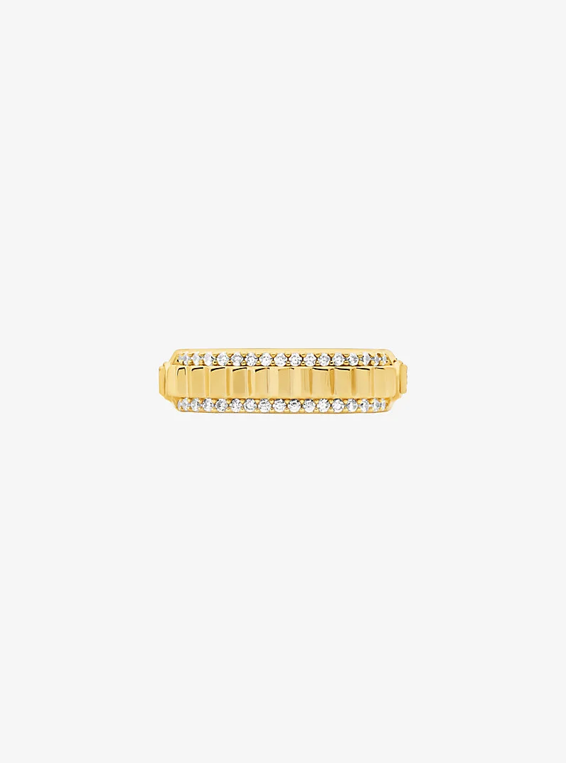 This eye-catching ring makes an outsize impression. Crafted from gold-tone brass, it features spiked ridges lined with rows of glittering pave for major shine. Wear it alone or stacked with mixed-metal rings. - Ring - Gold-tone brass - Cubic zirconia - 0.23” inner circumference - Imported - Michael Kors jewelry is made of precious metals combined with various elements including semi-precious stones. Apply perfume and cosmetics prior to putting on your jewelry. To clean your jewelry, wipe with the soft buffing cloth provided. Keep your jewelry away from moisture as it promotes tarnish. We recommend storing your jewelry in a clean, dry place, such as the pouch that the product comes in. - Style # MKJ8611