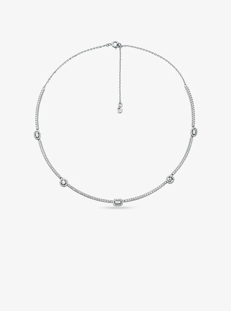 Glittering pave animates this precious metal-plated necklace, while faceted cubic zirconia and a subtle initial charm lend it scale and drama. Designed with an adjustable clasp, it falls at the collarbone for an elegant look. - Necklace - Sterling silver - Available in: rhodium plating - Chain: 15”L - Spring ring clasp - Imported - Michael Kors jewelry is made of precious metals combined with various elements including semi-precious stones. Apply perfume and cosmetics prior to putting on your jewelry. To clean your jewelry, wipe with the soft buffing cloth provided. Keep your jewelry away from moisture as it promotes tarnish. We recommend storing your jewelry in a clean, dry place, such as the pouch that the product comes in. - Style # MKC1713CZ