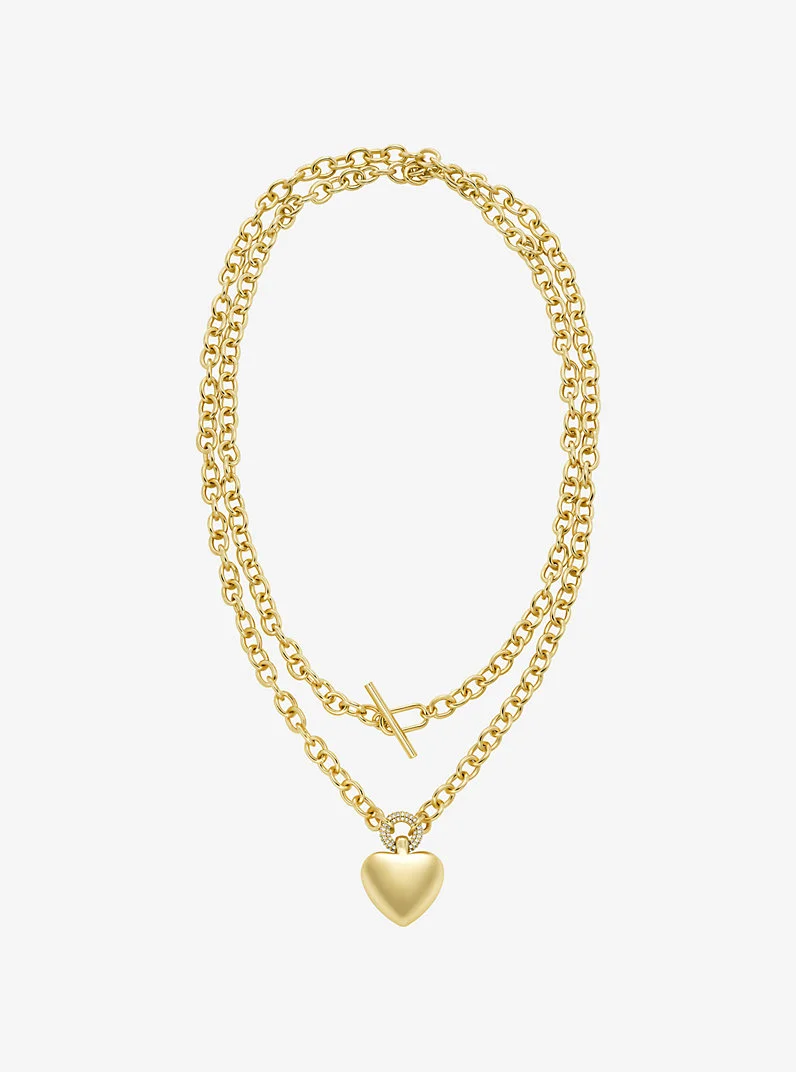 A romantic statement piece, this necklace features a puffy heart pendant suspended from a bold chain-link design. The pave embellishment adds a touch of sparkle, while the toggle clasp ensures easy on-and-off wear. Complete the look with the matching bracelet. - Necklace - Brass - Available in: gold tone and silver tone - Chain: 1.4”L - Toggle clasp fastening - Imported - Apply perfume and cosmetics prior to putting on your jewelry. To clean your jewelry, wipe with the soft buffing cloth provided. Keep your jewelry away from moisture as it promotes tarnish. We recommend storing your jewelry in a clean, dry place, such as the pouch that the product comes in. - Style # MKJ8589