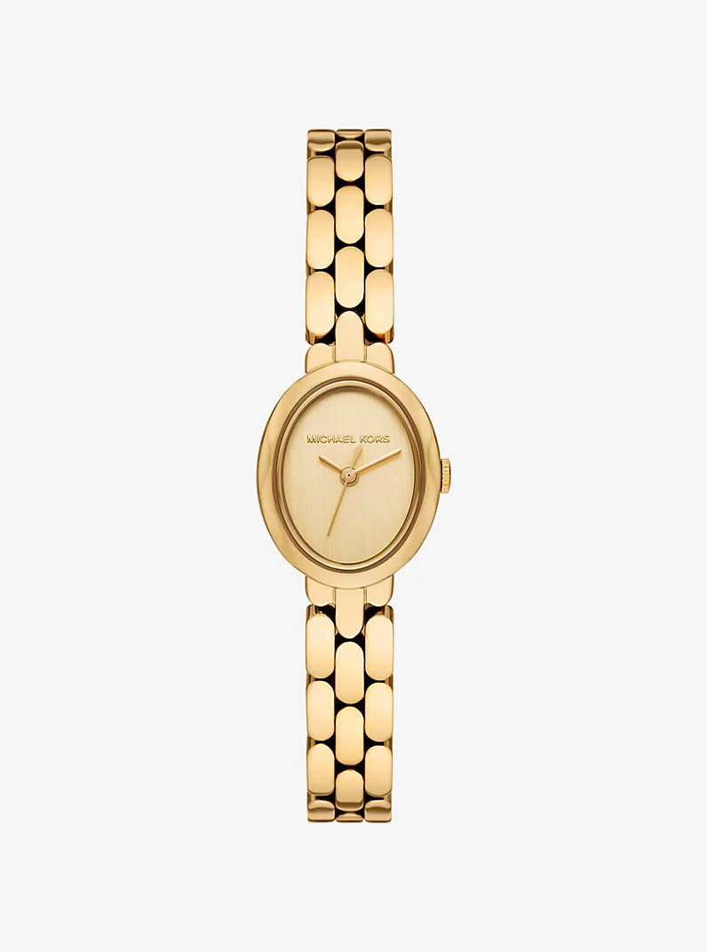 Designed for those who appreciate the luxury of time, the Maude watch draws inspiration from a timepiece belonging to Michael’s grandmother. It features an oval shaped dial and a stainless-steel bracelet strap that will stand up to endless wear. Wear it every day and let it become your signature heirloom. - Watch - Stainless steel - Gold-tone hardware - Mini - 20.5mm X 25.5mm case - Quartz/3-hand movement - Clasp fastening - Water resistant up to 3 ATM - 2-year warranty - Imported - Style # MK4955
