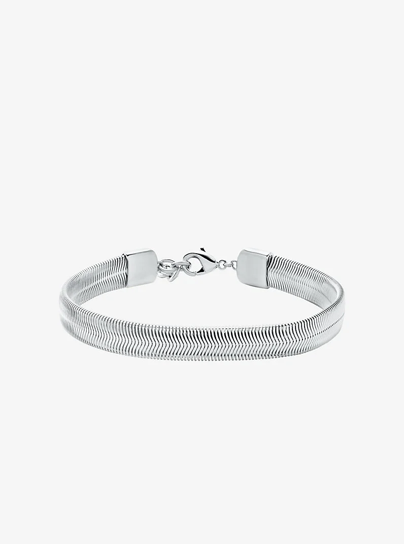 Upgrade your bracelet collection with this sleek style. The bold, chevron-shaped silhouette will add a touch of modern edge to any outfit. Stack it with an array of metallic chains to nail the mixed-metal look. - Bracelet - Brass - Available in: platinum plating, 14K gold plating - 0.31" inner circumference - Imported - Michael Kors jewelry is made of precious metals combined with various elements including semi-precious stones. Apply perfume and cosmetics prior to putting on your jewelry. To clean your jewelry, wipe with the soft buffing cloth provided. Keep your jewelry away from moisture as it promotes tarnish. We recommend storing your jewelry in a clean, dry place, such as the pouch that the product comes in. - Style # MKJ8487