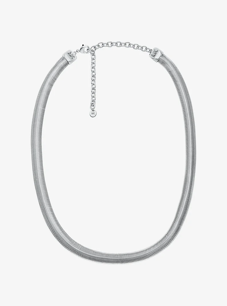 Keep it sleek with a modern snake chain necklace that’s worthy of everyday wear. This chevron-shaped style layers well with others, but particularly stands out solo against a bare neckline. - Necklace - Brass - Available in: platinum plating, 14K gold plating - Chain: 15.9” + 3.9“ extender - Clasp fastening - Imported - Michael Kors jewelry is made of precious metals combined with various elements including semi-precious stones. Apply perfume and cosmetics prior to putting on your jewelry. To clean your jewelry, wipe with the soft buffing cloth provided. Keep your jewelry away from moisture as it promotes tarnish. We recommend storing your jewelry in a clean, dry place, such as the pouch that the product comes in. - Style # MKJ8486