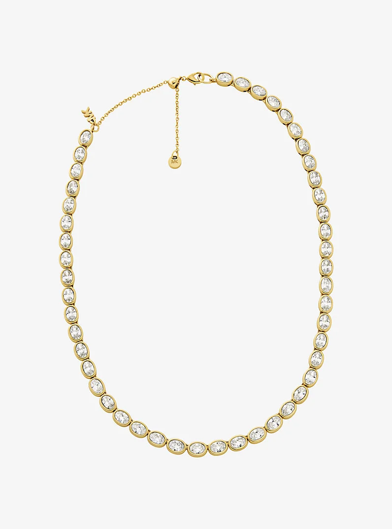 This dazzling tennis necklace features a full string of brilliant stones encased in 14K-gold-plated brass for added lustre. Wear it on its own or paired with the matching bracelet for a true statement look. - Tennis necklace - Brass - 14K gold plating - Cubic zirconia - 14.5L"+ 3” extender - Clasp fastening - Imported - Michael Kors jewelry is made of precious metals combined with various elements including semi-precious stones. Apply perfume and cosmetics prior to putting on your jewelry. To clean your jewelry, wipe with the soft buffing cloth provided. Keep your jewelry away from moisture as it promotes tarnish. We recommend storing your jewelry in a clean, dry place, such as the pouch that the product comes in. - Style # MKJ8469