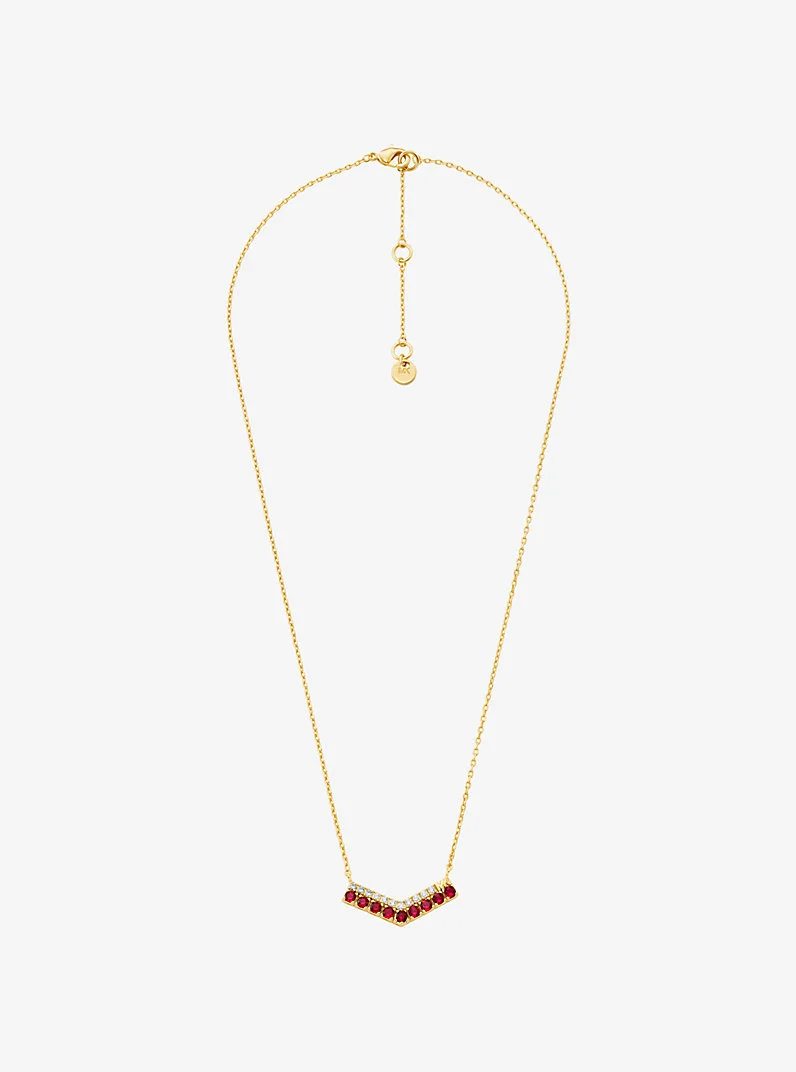 Smart enough for day and glamorous enough for night, this gold-tone brass necklace adds just the right amount of sparkle to your closet. It features a delicate fixed chain and a chevron-shaped pendant set with two rows of shimmering cubic zirconia in contrasting hues. Wear it to special occasions or as your everyday signature. - Necklace - Gold-tone brass - Cubic zirconia - Chain: 16"L + 2"extender - Spring ring clasp - Imported - Apply perfume and cosmetics prior to putting on your jewelry. To clean your jewelry, wipe with the soft buffing cloth provided. Keep your jewelry away from moisture as it promotes tarnish. We recommend storing your jewelry in a clean, dry place, such as the pouch that the product comes in. - Style # MKJ8563