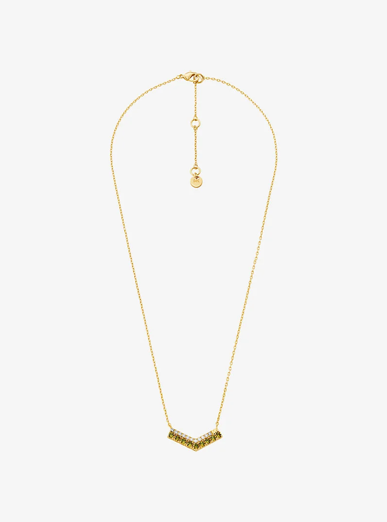 Smart enough for day and glamorous enough for night, this gold-tone brass necklace adds just the right amount of sparkle to your closet. It features a delicate fixed chain and a chevron-shaped pendant set with two rows of shimmering cubic zirconia in contrasting hues. Wear it to special occasions or as your everyday signature. - Necklace - Gold-tone brass - Cubic zirconia - Chain: 16"L + 2"extender - Spring ring clasp - Imported - Apply perfume and cosmetics prior to putting on your jewelry. To clean your jewelry, wipe with the soft buffing cloth provided. Keep your jewelry away from moisture as it promotes tarnish. We recommend storing your jewelry in a clean, dry place, such as the pouch that the product comes in. - Style # MKJ8562