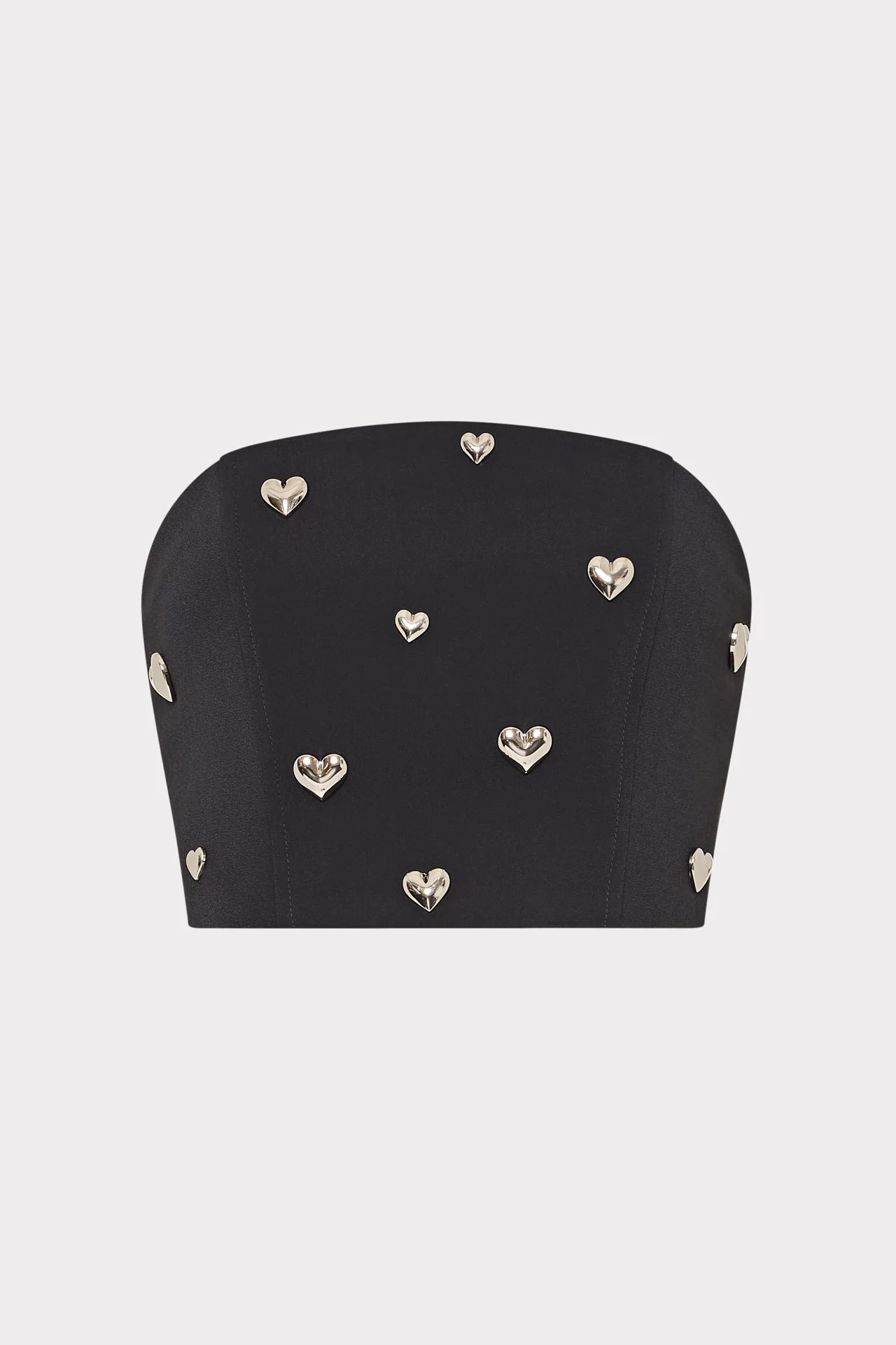 Crafted from a comfortable poly blend, the Sharlee is a strapless tube top designed to show a bit of skin. Resort, it’s offered in black with a hint of stretch and silver metal heart applique throughout. For the full look, wear it with its coordinating Syra Heart Skirt. PRODUCT DETAILS - Tube top - Strapless - Sparkly - Fabric: 97% Polyester, 3% Spandex Style Number: 82ST49 CARE INFORMATION Dry Clean Only SIZE + FIT Size: Runs true to size. Fit: Form Fitting Model info: Model is wearing a size Small and is 5'10", Bust: 33", Waist: 24", Hips: 37" Measurements: Approx. 9" in length from shoulder to hem for size Small