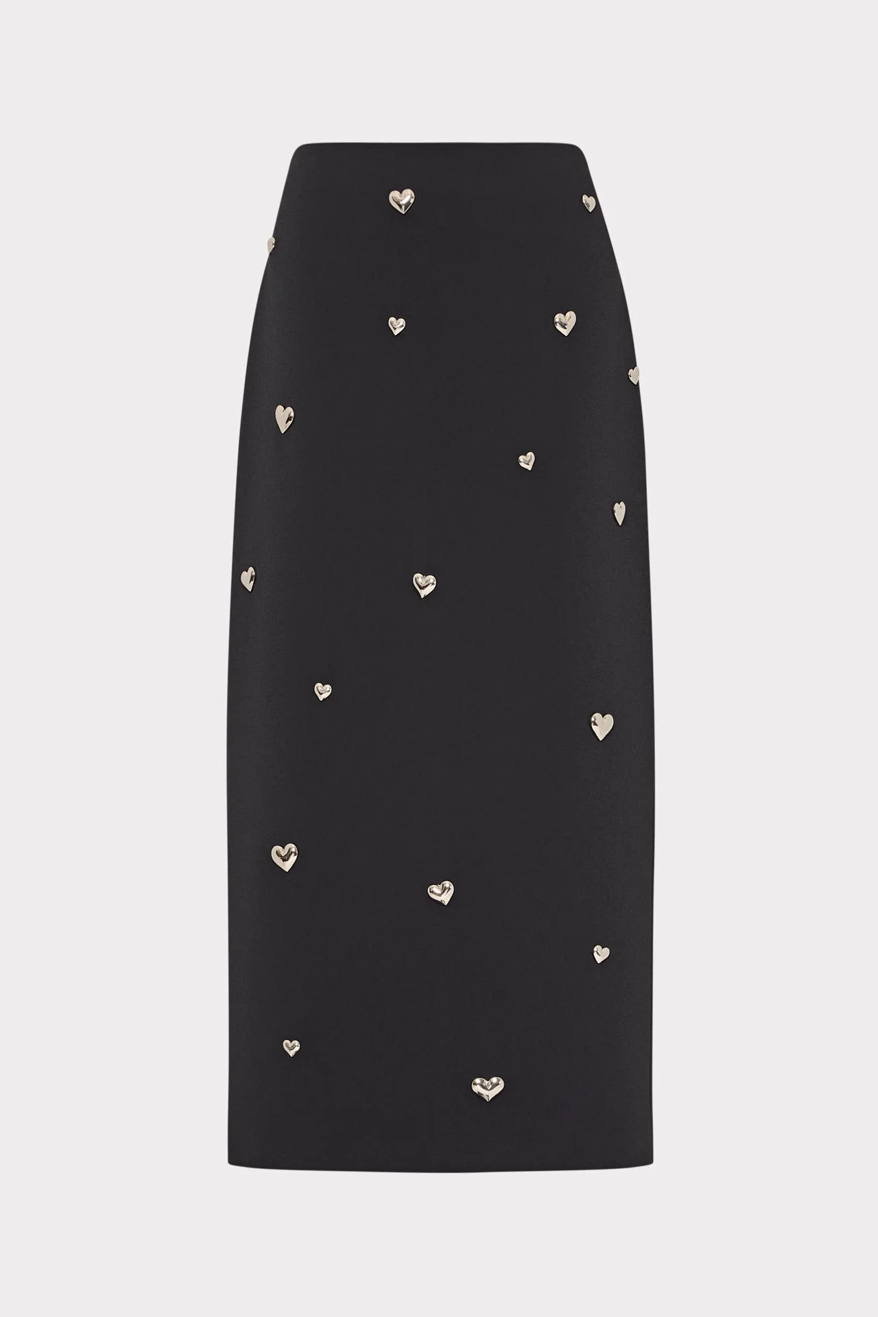 Crafted from a comfortable poly blend, the Syra skirt is a long, column silhouette that hits just above the ankles. It’s offered in sparkly black with a hint of stretch and tiny heart applique throughout. For the full look, wear it with its coordinating Sharlee Heart Tube Top. PRODUCT DETAILS - Body skimming - Maxi skirt - Sparkle over boddice - Fabric: 100% Polyester Style Number: 82SS51 CARE INFORMATION Dry Clean Only SIZE + FIT Size: Runs true to size Fit: Fitted Model info: Model is wearing a size 2 and is 5'10", Waist: 24", Hips: 34" Measurements: Approx. 32” in length for size 4
